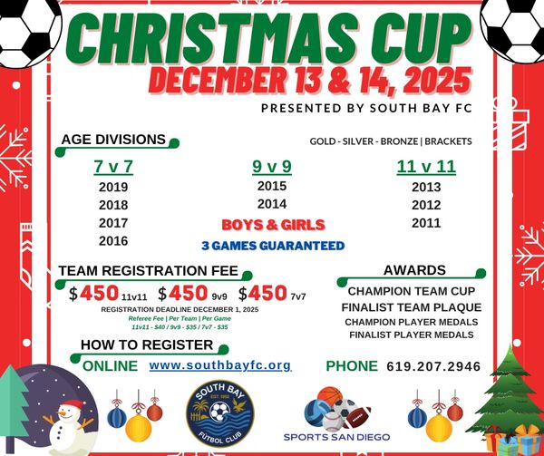 Welcome to Christmas Cup 2025 to all the teams that registered for the 2025 edition. Schedule will be posted Saturday, December 6, 2025